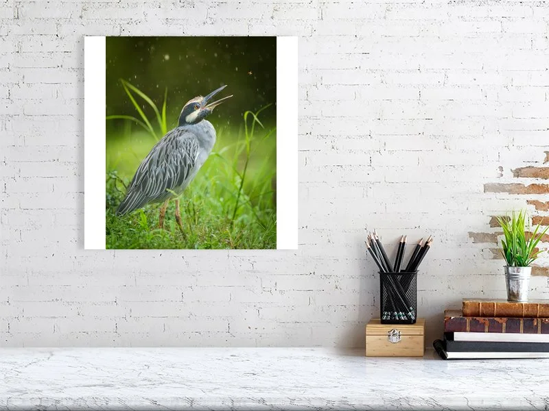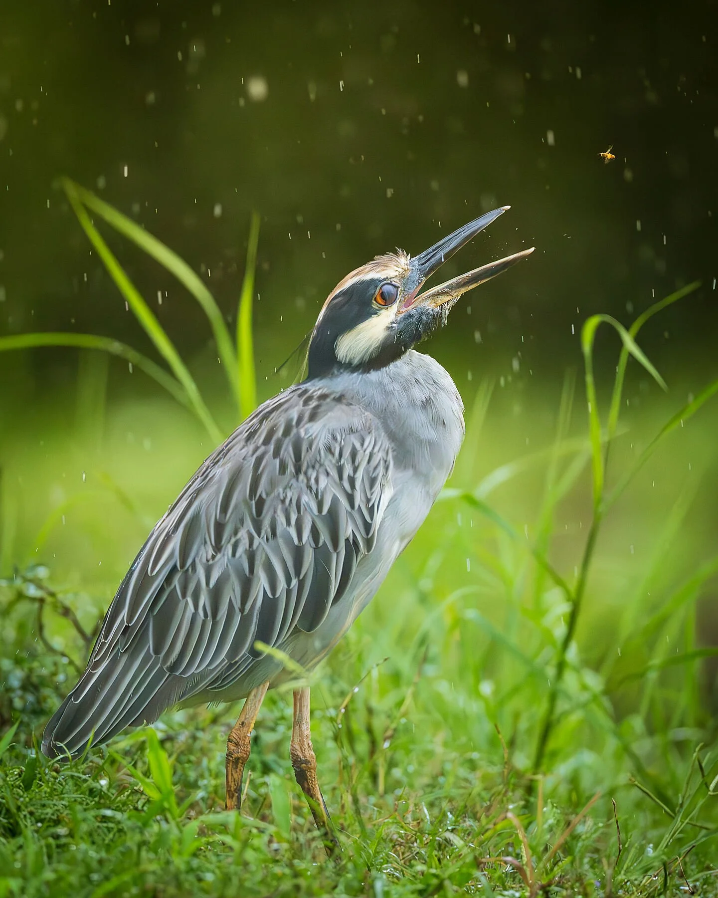 Captured from a boat on the Sierpe River in Puntarenas, Costa Rica, a Night Heron out on a rainy stroll is about to strike as a passing bee.